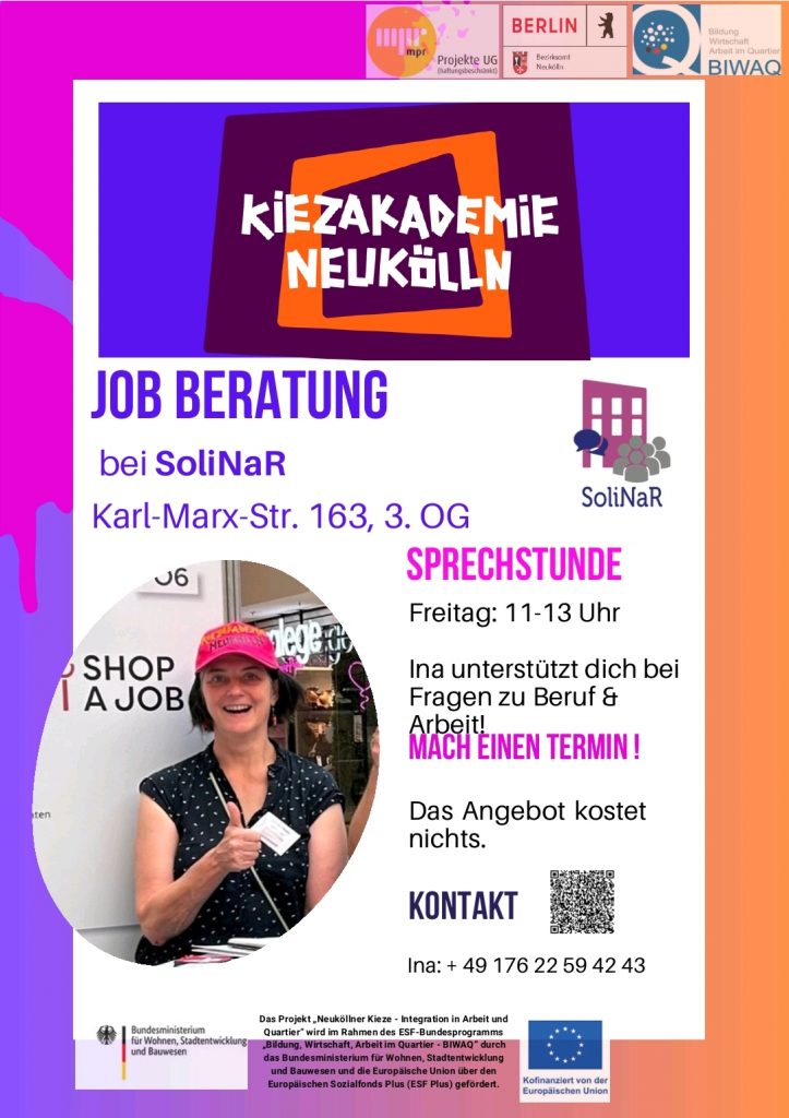 Die Kiezakademie Neukölln ist eine kostenlose Anlaufstelle für alle, die einen Jobsuchen. Niederschwellig und kostenlos berät die Kiezakademie auf Deutsch, Englisch und Arabisch.